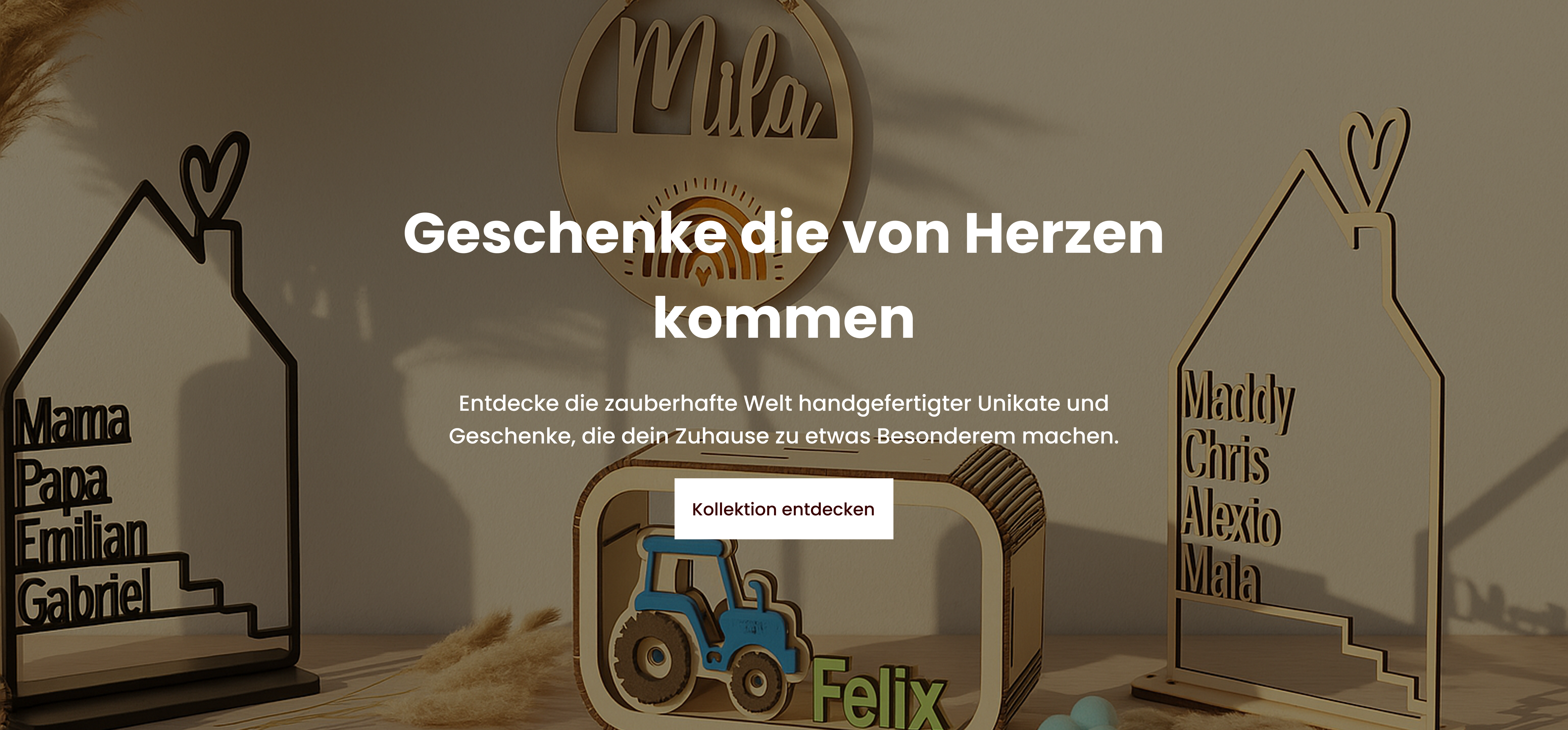Mit viel Liebe zum Detail gestalten wir besondere Geschenke und Dekorationen, die mehr sind als nur ein Produkt: Sie sind Ausdruck von Kreativität, Persönlichkeit, Freude und Erinnerungen.